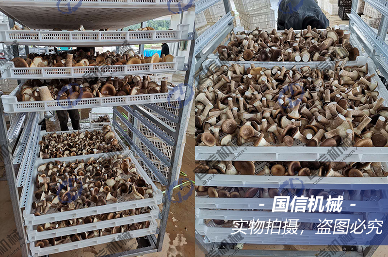 香菇烘干工藝對(duì)裝盤的要求嚴(yán)格。裝盤時(shí),需將菌蓋朝上,菌柄朝下,均勻擺放,不能重疊或者堆積,防止對(duì)香菇造成損壞,從而影響質(zhì)量。建議采摘后的6個(gè)小時(shí)內(nèi)必須送入烘干房,如有剩余,則需放入冷庫(kù)進(jìn)行冷藏。