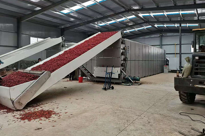 辣椒烘干機由4個部分組成,分別是上料輸送機、網(wǎng)帶式烘干機主機、熱源、出料輸送機。轉換爐提供熱量;網(wǎng)帶式穿流干燥機是干燥設備的主體,由機體和多層輸送帶組成;電控系統(tǒng)控制整個設備的啟動、運轉與停止。