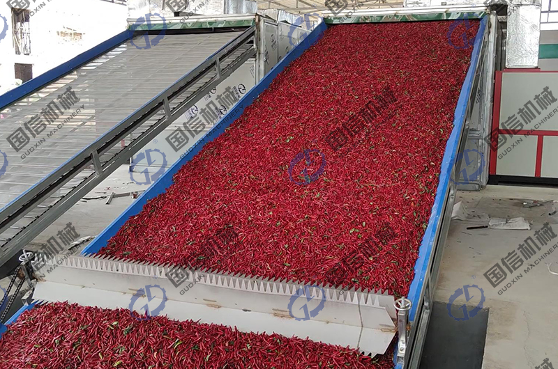 國(guó)信廠家生產(chǎn)的大型辣椒烘干機(jī)是一種箱式結(jié)構(gòu),材質(zhì)有烤漆、不銹鋼、彩鋼三種材質(zhì)可供選擇。內(nèi)部是由一層一層的不銹鋼網(wǎng)組成。辣椒經(jīng)過(guò)輸送帶進(jìn)入到烘干箱內(nèi)部,在內(nèi)部逐層的移動(dòng)翻轉(zhuǎn),密集的網(wǎng)孔用來(lái)輸送辣椒的同時(shí)還能透氣,使熱源產(chǎn)生的熱氣在透過(guò)網(wǎng)孔穿過(guò)物料層的時(shí)候帶走辣椒內(nèi)部的水分。