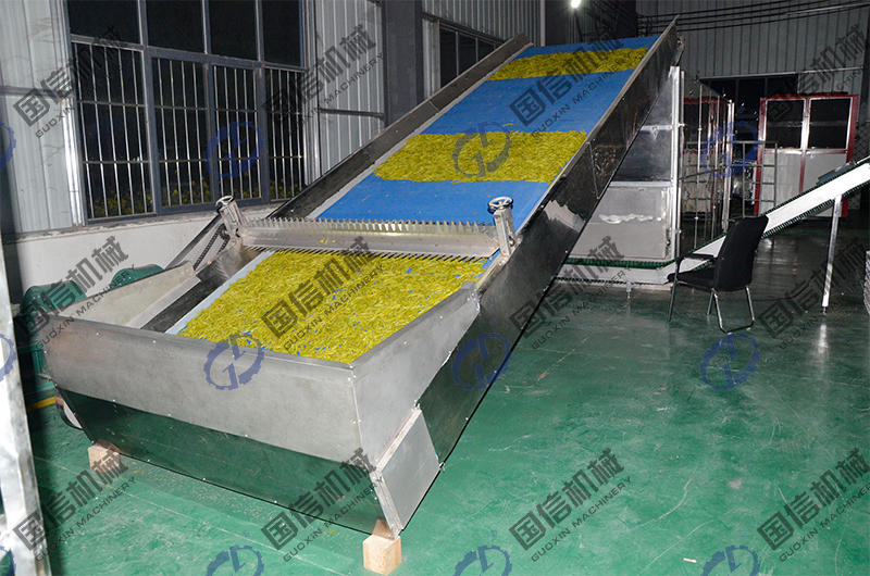 黃花菜全自動殺青烘干流水線設備具有規(guī)?;⒋笈?、連續(xù)式加工生產(chǎn)的效果,一次開機就能夠對采摘后的所有黃花菜實現(xiàn)干制加工,產(chǎn)量非常大時,還能夠24小時連續(xù)生產(chǎn),具有閃蒸、殺青、烘干的一體化功能,日處理可達萬斤至十幾萬斤。使用這種新型黃花菜殺青烘干一體機整個加工過程,只需1~2人即可完成,改變了傳統(tǒng)烘干勞動力強度大的缺點,干燥時間也縮短了3分之二以上,也大大的節(jié)約了成本,熱源方面可以選擇燃煤、燃生物質(zhì)顆粒、天然氣、蒸汽、電(空氣能熱泵)等類型,然后搭配國信廠家的換熱系統(tǒng),置換出純凈的熱風對黃花菜干制加工,不會對其品質(zhì)造成污染,再加上智能化控制系統(tǒng),可以提升烘干品質(zhì),是集中產(chǎn)業(yè)化黃花菜烘干的理想設備。