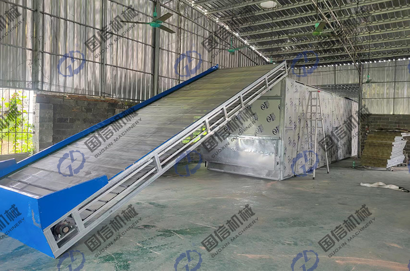 這臺(tái)全自動(dòng)網(wǎng)帶式烘干機(jī),采用的是多層循環(huán)翻轉(zhuǎn)結(jié)構(gòu),經(jīng)清洗加工后的中藥材會(huì)經(jīng)過上料輸送機(jī)均勻地送入烘干主機(jī)內(nèi)部,會(huì)在內(nèi)部多層不銹鋼網(wǎng)帶的傳送下,循環(huán)翻轉(zhuǎn),與此同時(shí),熱源提供的熱量,會(huì)在引風(fēng)機(jī)的作用下,以熱風(fēng)的形式進(jìn)入烘干主機(jī)底部,熱風(fēng)會(huì)自下而上的逐層穿過不銹鋼網(wǎng)帶物料層,帶走其中的水分,從烘干主機(jī)頂部排出,達(dá)到中藥材干燥效果。