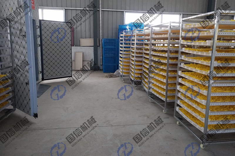 金絲皇菊烘干房采用的是靜態(tài)烘干模式,通過熱源裝置,讓烘干房?jī)?nèi)的溫度升高到制定值,對(duì)擺放在房?jī)?nèi)的菊花進(jìn)行干制。烘干房的智能化控制系統(tǒng),可以對(duì)溫度和濕度進(jìn)行精準(zhǔn)控制,以達(dá)到金絲皇菊烘干的目的。金絲皇菊烘干機(jī)是由熱泵主機(jī),保溫板房、交叉換熱器、循環(huán)風(fēng)機(jī)、排濕系統(tǒng)、排濕風(fēng)機(jī)、控制系統(tǒng)、推車、托盤等部分組成。