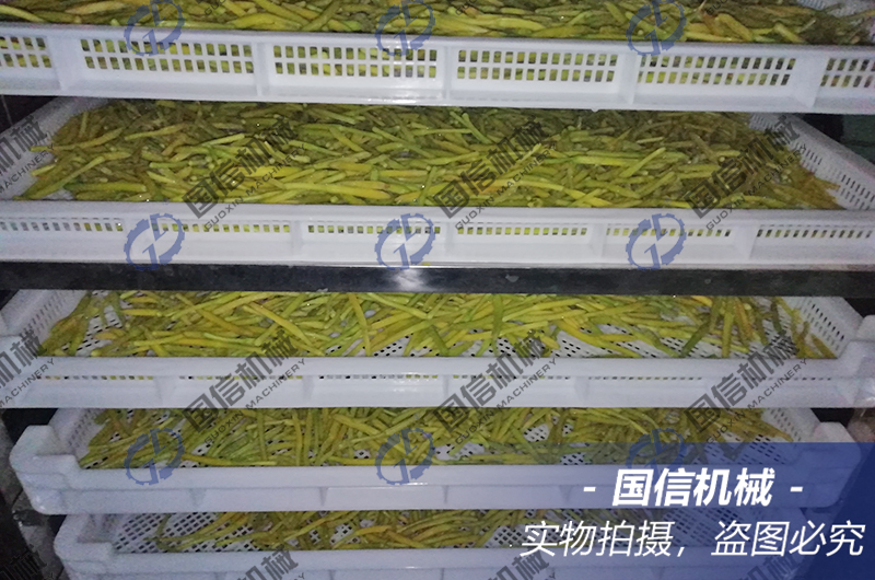 黃花菜烘干房按照產(chǎn)量大小,可以分為大型、中型和小型三種: 小型烘干房的產(chǎn)量可以日烘干處理黃花菜鮮貨200公斤到800公斤,一共可放置96個標(biāo)準(zhǔn)托盤,托盤尺寸為430毫米寬、750毫米長。相當(dāng)于每個托盤可以放置8公斤左右的鮮黃花菜片。