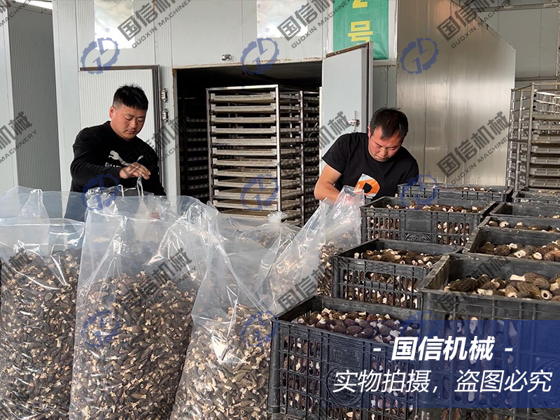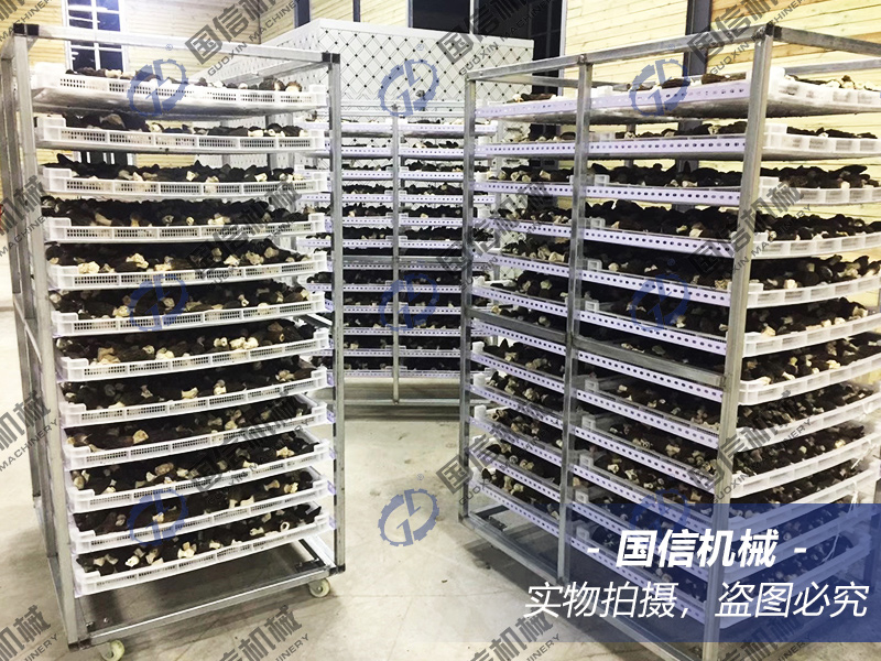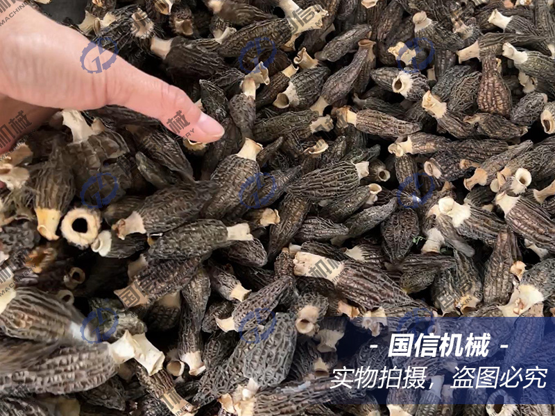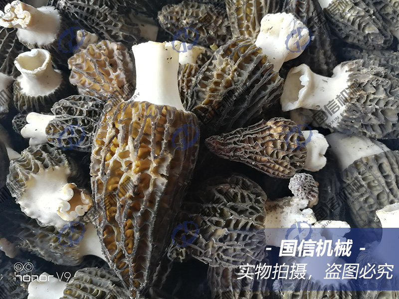 無(wú)需冷藏保鮮的羊肚菌按不同長(zhǎng)度進(jìn)行剪柄后,排放于烘篩上,將烘篩推入烘干機(jī)烘箱內(nèi),緊閉箱門開(kāi)始啟動(dòng)機(jī)器起烘。起烘溫度不能低于35℃,最好是35℃起烘,濕度控制在70%以內(nèi),時(shí)間3小時(shí)左右,用低溫來(lái)給羊肚菌定性定色,以保證其形狀飽滿,不塌陷。