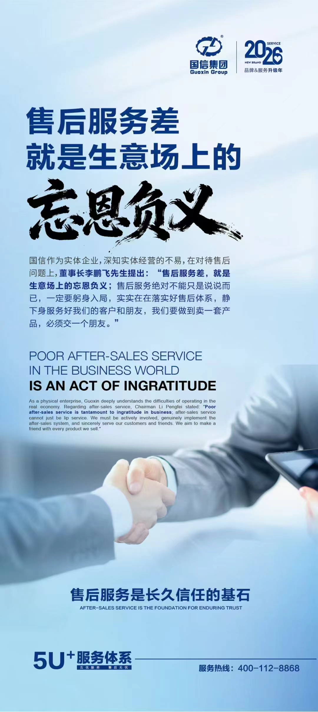 在機(jī)械裝備制造業(yè)深耕十五年之際,國(guó)信集團(tuán)于2025年11月27日正式提出全新的5U+服務(wù)理念,以“五優(yōu)服務(wù),售后無(wú)憂”為核心承諾,致力于為全球客商打造一個(gè)覆蓋售前、售中、售后的全閉環(huán)、全維度服務(wù)體驗(yàn)。這一理念的提出,標(biāo)志著國(guó)信集團(tuán)在持續(xù)提升產(chǎn)品力的同時(shí),全面邁向“以客戶體驗(yàn)為中心”的服務(wù)新階段。