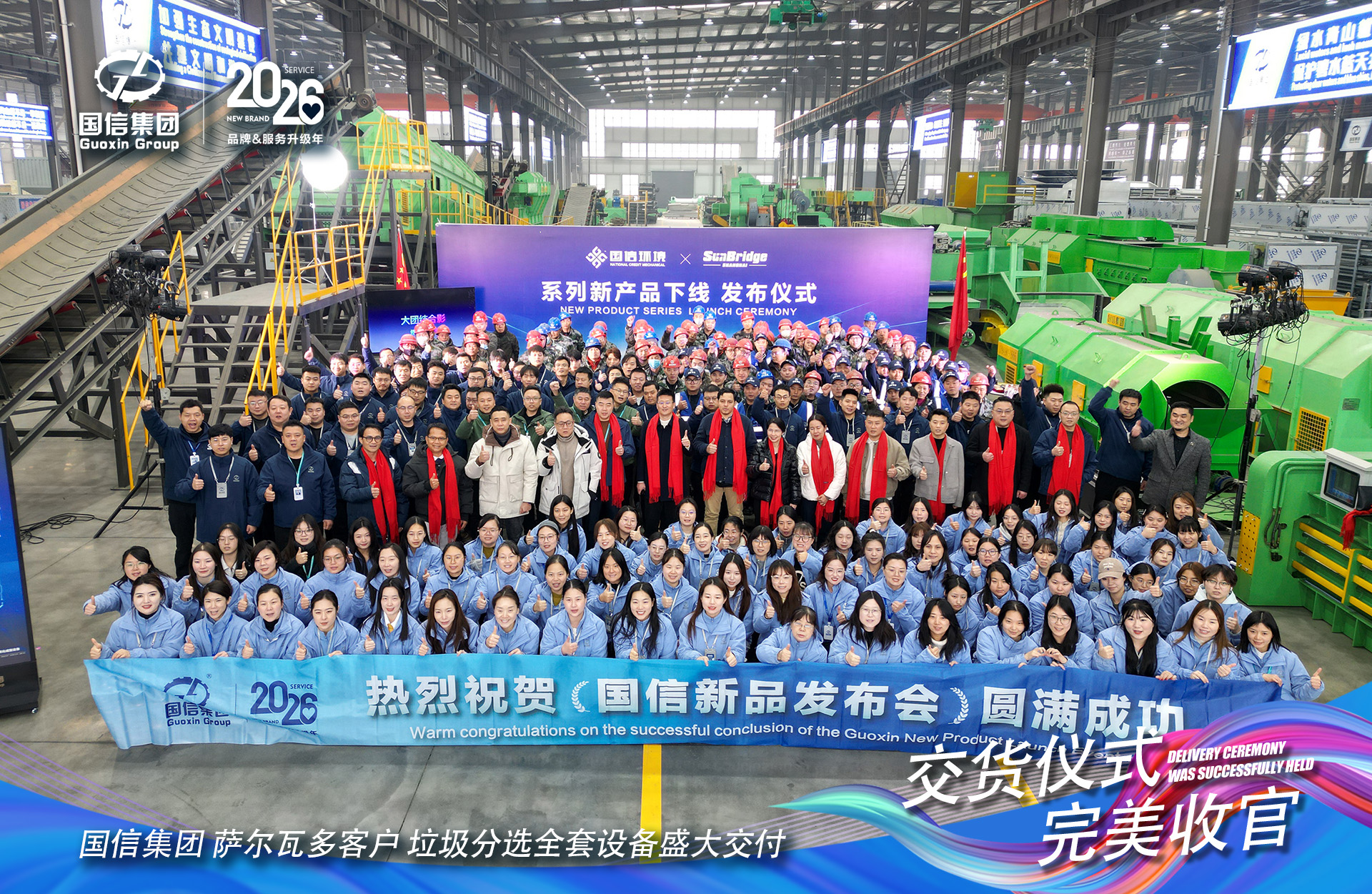 儀式現(xiàn)場,凝聚了國信十五年行業(yè)洞察與最新研發(fā)成果的第三代垃圾分選設(shè)備正式揭幕。在全體嘉賓的共同見證下,國信集團第三代垃圾分選設(shè)備正式下線。本代設(shè)備圍繞真實應(yīng)用場景進行系統(tǒng)升級,涵蓋給料機、破袋機、滾筒篩、綜合風(fēng)選機、撕碎機、RDF成型機等核心單元,在結(jié)構(gòu)優(yōu)化、處理效率、運行穩(wěn)定性等方面實現(xiàn)全面提升。第三代垃圾分選設(shè)備的下線,標(biāo)志著國信集團在垃圾分選系統(tǒng)化、模塊化和工程適配能力上的又一次進階。