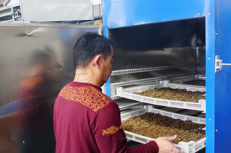 接下來(lái)把洗凈的蝎子裝盤,放到烘干箱進(jìn)行干燥,據(jù)技術(shù)介紹:在蝎子的加工過(guò)程中,動(dòng)作一定要輕拿輕放,盡可能保持蝎子的完好,避免因斷頭、尾、足,降低了蝎子的藥效。