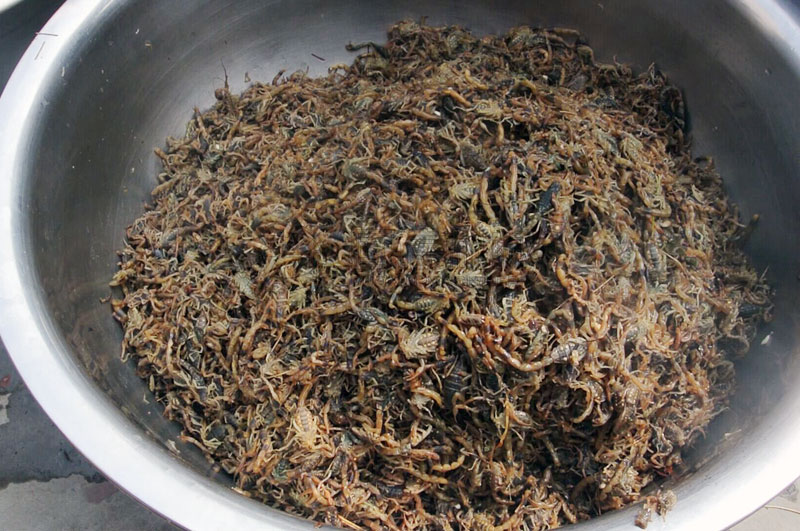 隨后,由我廠技術(shù)人員陪同客戶,為客戶演示整個(gè)加工過(guò)程,加工前先把蝎子用冷水浸泡,并反復(fù)沖洗幾次,以洗掉蝎子身體上的泥土和其他雜物,洗凈后撈出,放到事先準(zhǔn)備好的盆內(nèi)。