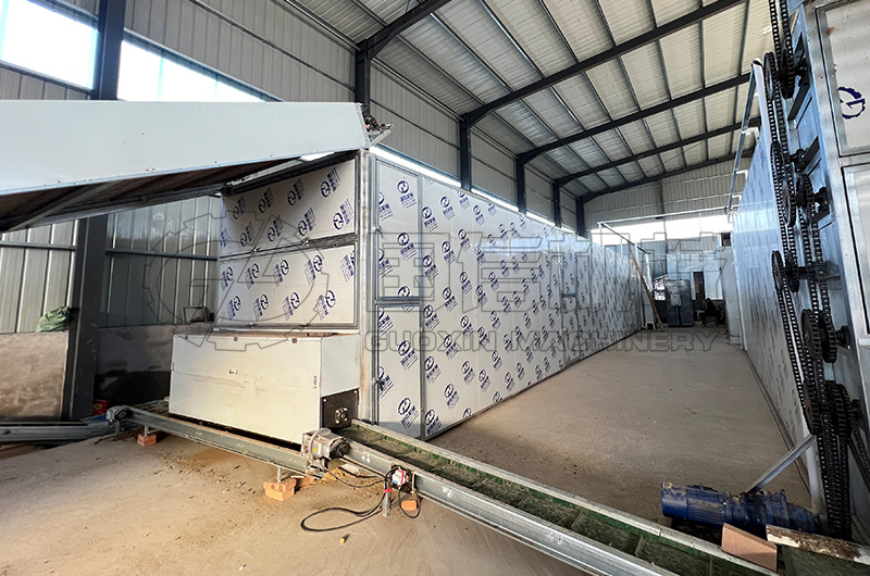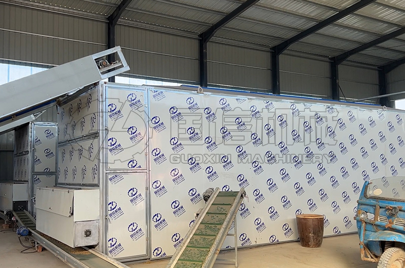 大型全自動網(wǎng)帶地黃烘干機,采用的是多層循環(huán)翻轉(zhuǎn)結(jié)構(gòu),經(jīng)清洗加工后的地黃會經(jīng)過上料輸送機均勻地送入烘干主機內(nèi)部,會在內(nèi)部多層不銹鋼網(wǎng)帶的傳送下,循環(huán)翻轉(zhuǎn),與此同時,熱源提供的熱量,會在引風(fēng)機的作用下,以熱風(fēng)的形式進入烘干主機底部,熱風(fēng)會自下而上的逐層穿過不銹鋼網(wǎng)帶物料層,帶走其中的水分,從烘干主機頂部排出,達到地黃干燥效果。