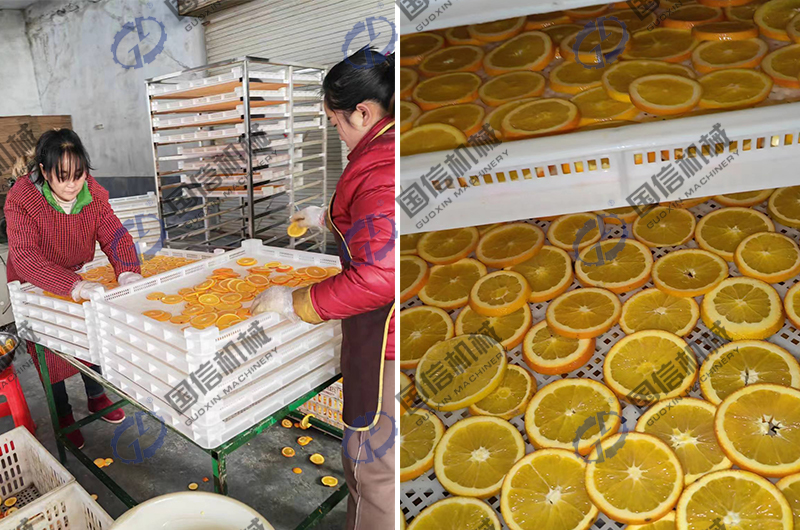 首先把橙子進行清洗切片,均勻的擺放在托盤上,放入烘干房內(nèi)即可;烘干階段,設(shè)定橙子烘干所需的溫度濕度等參數(shù),一般溫度在45-60度之間,時間大約5小時以上,按照你所需要的軟硬程度,設(shè)定具體的控制時間即可。使用這種橙子烘干工藝,對橙子進行烘干,可以很好的保證橙子干自身的口感,也解決了橙子產(chǎn)量過剩的問題,有效的增加了橙子自身的經(jīng)濟價值,這也是我們國信機械廠家眾多水果烘干加工的一種,其實我們在為客戶提供烘干設(shè)備的同時,也會對物料干制加工進行整體的烘干解決方案提供,通過近二十年的發(fā)展,我們積累了大量的水果烘干加工經(jīng)驗,如果你有相關(guān)需求,可與我們聯(lián)系,進行相關(guān)的經(jīng)驗交流。
